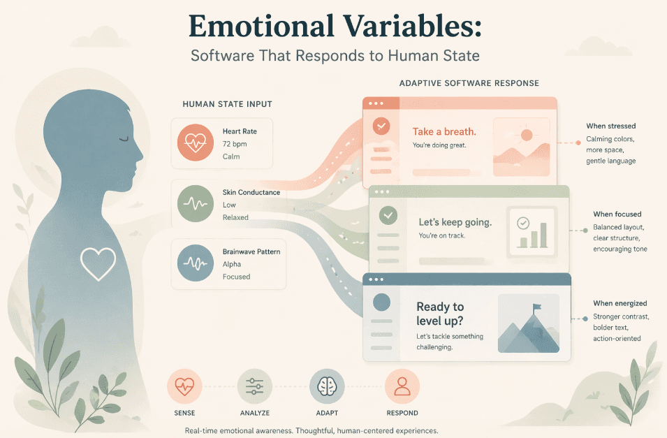 You've been clicking through the same broken checkout flow for the third time. Your heart rate is up. Your mouse movements are aggressive and imprecise. You're about to abandon the cart. The application has no idea. It's showing you the same button in the same shade of blue at the same size as when you were in a good mood twelve minutes ago.