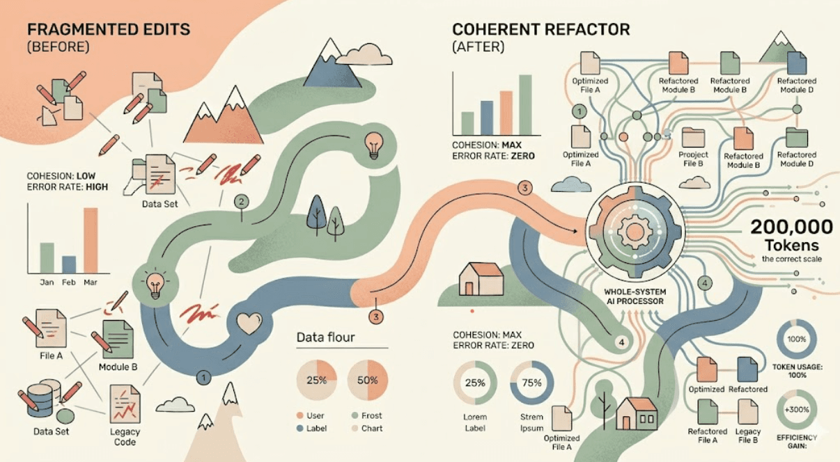 The implications for refactoring are profound. For the first time, you can ask an AI to understand a dependency graph that spans dozens of files, trace a data flow through an entire pipeline from database to UI, or identify all the places where a given assumption is encoded across your codebase. And have it actually be right.