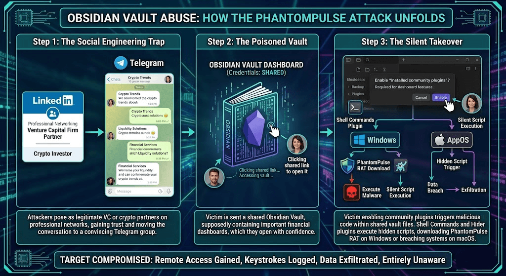 Recently, cybersecurity researchers uncovered a highly sophisticated, completely novel attack method targeting individuals in the financial and cryptocurrency sectors. Instead of relying on traditional email attachments or shady download links, hackers are now abusing Obsidian, a popular, widely trusted note-taking application. They are using it to deliver a vicious piece of malware known as the PhantomPulse RAT.