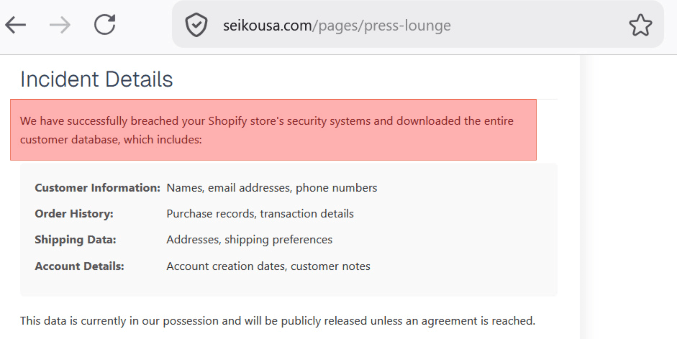 Over the weekend of April 18 and 19, 2026, people browsing Seiko USA's corporate site did not get the usual press updates. The Press Lounge section had been replaced with a blunt defacement and an "urgent security" style message. The page said the site was compromised. It also made a much bigger allegation: that attackers had reached Seiko's Shopify backend and taken the company's entire customer database.