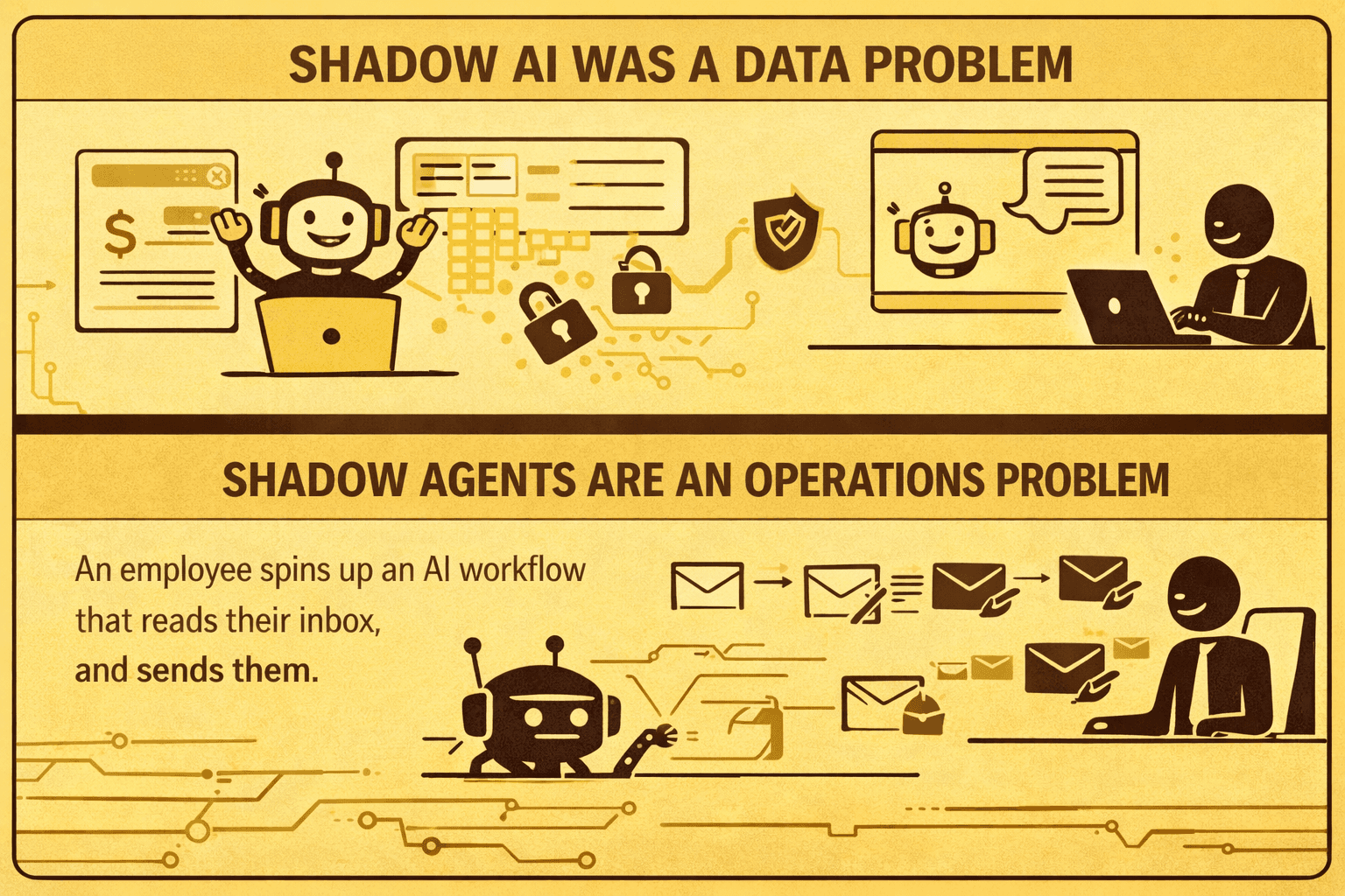 Shadow AI was a data problem. Someone pastes confidential revenue numbers into Claude to build a summary. The risk is data leakage. You can mitigate it with DLP policies, approved tool lists, and access controls.