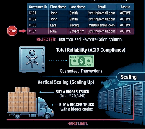 If you try to add a customer but want to include their Favorite Color or a Profile Picture, the SQL database will reject it. You cannot break the template.