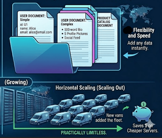 Because there are no strict templates, you can throw a document containing a user’s Name and Email right next to a document containing a user’s Name, Email, 500-word Bio, and 5 Profile Pictures. The NoSQL database doesn't care; it happily stores them both.