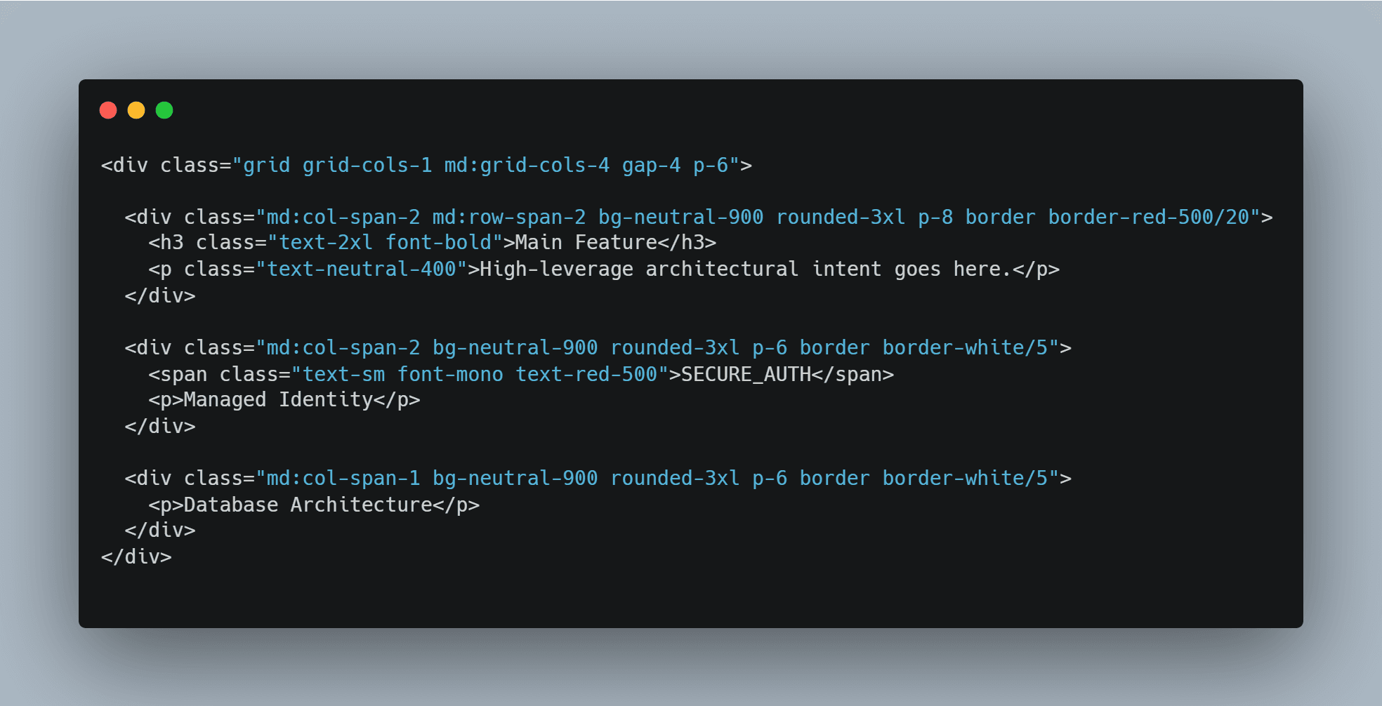 Building a Bento Grid used to require complex math and absolute positioning. In 2026, we do it with CSS Grid and a few utility classes.